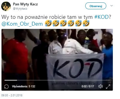 W internecie znalazło się dość zabawne nagranie, na którym grupa czarnoskórych mężczyzn z transparentem Komitetu Obrony Demokracji wykrzykuje z radością "Kaczyński-nie!"