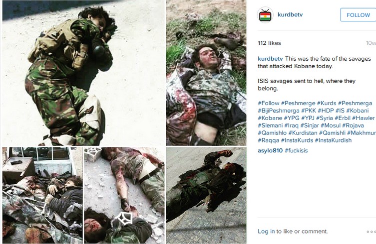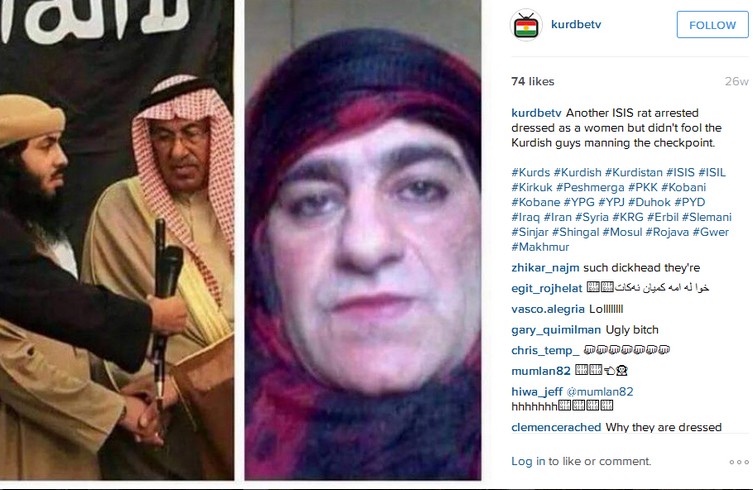 Teraz powinna zapalić Wam się lampka pt. Skąd ten Gnyszka wie co się dzieje w Kobane i co też on wymyślił z tymi makijażami? W dzisiejszych czasach na szczęście łatwo być na bieżąco i to nie dzięki tygodnikom, ani dziennikom, ani tym bardziej telewizji, która pewnie nie ma korespondentów na froncie w Kobane, ale dzięki… mediom społecznościowym. Zdjęcia martwych ISISowców z warkoczami i w makijażu oglądałem na jednym z kurdyjskich profili na instagramie. Na pamiątkę wkleiłbym poniżej, ale liczne zdjęcia ISISowskich trupów po wyczyszczeniu Kobane Instagram zdążył usunąć z profilu KurdBe TV. Zachowało się jedno, ale z innej okazji. Oto jedna z dużych ISISowskich figur chciała przekroczyć granicę z Kurdystanem w przebraniu kobiety. Prawda, że dobry makijaż?