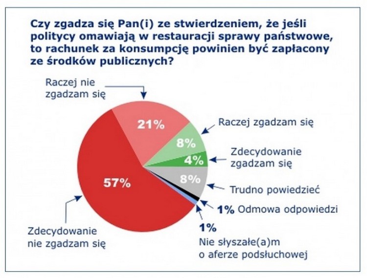 Dla większości Polaków, ujawnione nagrania tzw. afery podsłuchowej to totalna kompromitacja polityków związanych z Platformą Obywatelską: Zaledwie 3% badanych stwierdziło, iż w tzw. aferze podsłuchowej nie ma nic bulwersującego. Największa grupa ankietowanych (32%) jest oburzona faktem pokrywania rachunków za drogie dania i alkohole z funduszy instytucji publicznych - podaje CBOS.