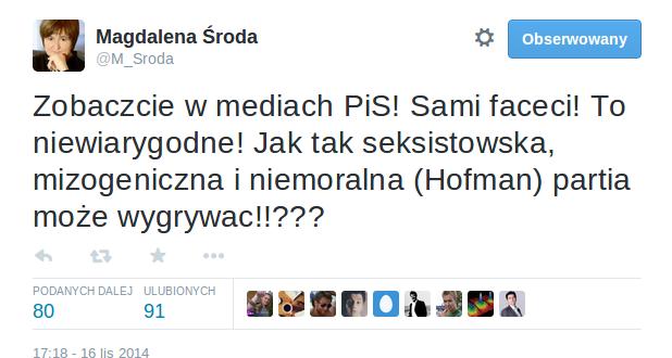 W feministycznym tonie uderzyła prof. Magdalena Środa, której nie podoba się, że w PiS są... mężczyźni. „Zobaczcie w mediach PiS! Sami faceci! To niewiarygodne! Jak tak seksistowska, mizogeniczna i niemoralna (Hofman) partia może wygrywać!!???” - napisała na Twitterze (pisownia oryginalna).
