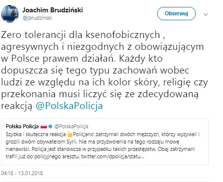 „Zero tolerancji dla ksenofobicznych, agresywnych i niezgodnych z obowiązującym w Polsce prawem działań”- napisał na Twitterze nowy minister spraw wewnętrznych i administracji, Joachim Brudziński.