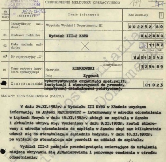 8 Insp. Wydz. III KS MO [podpis nieczytelny], Notatka służbowa, Warszawa, 17 I 1977 r., SOR krypt. Macek, t. 1, skan nr 252.