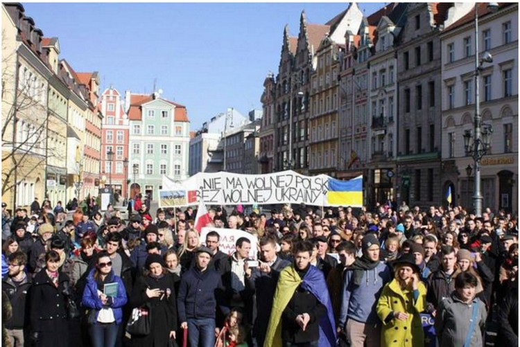 Manifestacja poparcia dla Ukrainy, która odbyła się 23 lutego we Wrocławiu. Pojawił się na niej duży baner z hasłem „Nie ma wolnej Polski bez wolnej Ukrainy”.