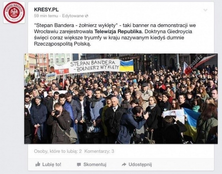 „Stepan Bandera - żołnierz wyklęty” taki baner na demonstracji we Wrocławiu zarejestrowała Telewizja Republika – napisał na swoim profilu społecznościowym portal Kresy.pl, zamieszczając zdjęcie.