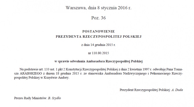 Decyzją prezydenta Andrzeja Dudy Tomasz Arabski został dziś odwołany ze stanowiska Ambasadora Nadzwyczajnego i Pełnomocnego Rzeczypospolitej Polskiej w Księstwie Andory. Współpracownik Donalda Tuska pełnił tę funkcję od maja 2013 roku.