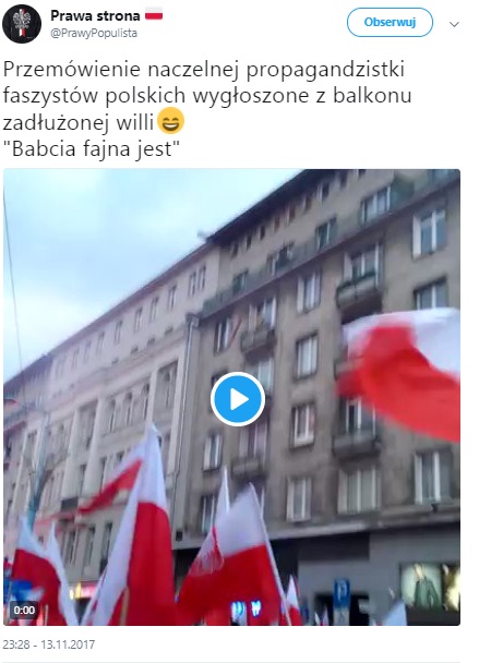 Furorę w mediach społecznościowych robi film z tegorocznego marszu. Widać na nim starszą kobietę, która pozdrawia uczestników Marszu Niepodległości z balkonu swojego mieszkania. Kobieta macha flagą Polski, a uczestnicy marszu śpiewają: "W górę serca, babcia fajna jest!"