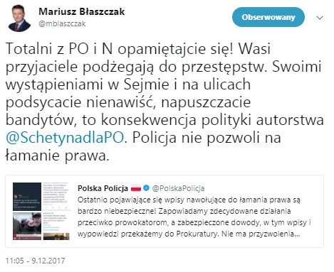 "Totalni z PO i N opamiętajcie się! Wasi przyjaciele podżegają do przestępstw. Swoimi wystąpieniami w Sejmie i na ulicach podsycacie nienawiść, napuszczacie bandytów, to konsekwencja polityki autorstwa @SchetynadlaPO. Policja nie pozwoli na łamanie prawa"- napisał na Twitterze minister spraw wewnętrznych i administracji.