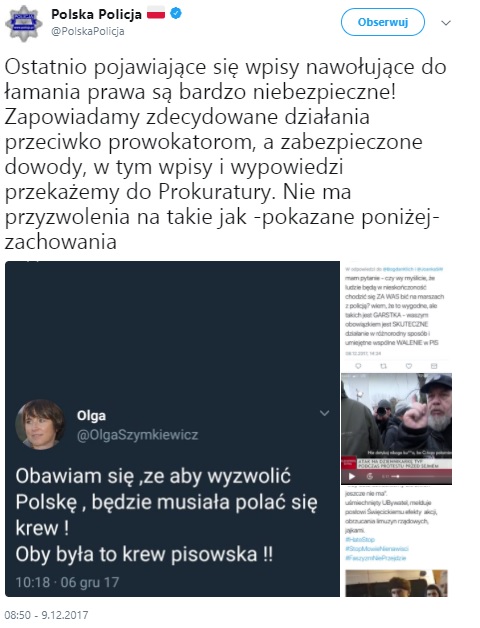 "Ostatnio pojawiające się wpisy nawołujące do łamania prawa są bardzo niebezpieczne! Zapowiadamy zdecydowane działania przeciwko prowokatorom, a zabezpieczone dowody, w tym wpisy i wypowiedzi przekażemy do Prokuratury. Nie ma przyzwolenia na takie jak -pokazane poniżej- zachowania"-napisano na twitterowym profilu polskiej policji.