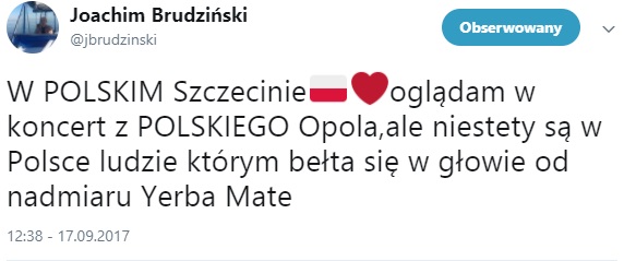 "W POLSKIM Szczecinie oglądam w koncert z POLSKIEGO Opola, ale niestety są w Polsce ludzie którym bełta się w głowie od nadmiaru Yerba Mate"- napisał na Twitterze wicemarszałek Sejmu.