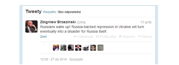 "Rosjanie obudźcie się! Wspierane przez Rosję represje na Ukrainie w końcu zamienią się w katastrofę dla samej Rosji" - napisał na Twitterze Zbigniew Brzeziński.