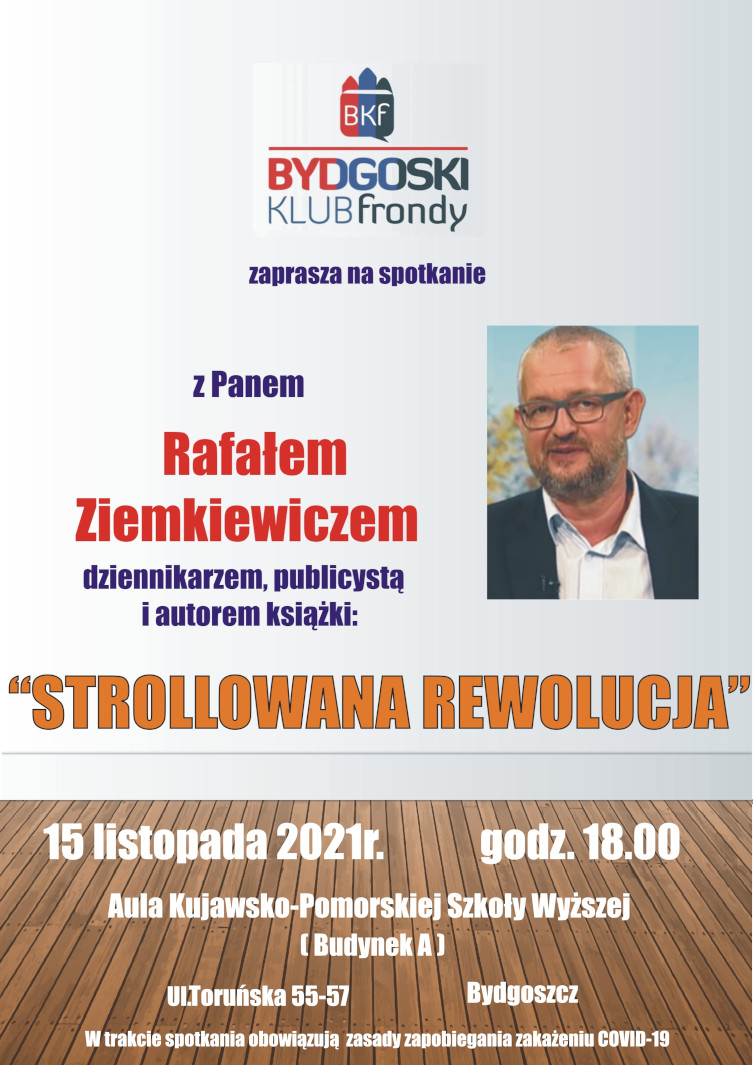 Bydgoski Klub Frondy zaprasza na spotkanie z dziennikarzem i publicystą, Panem Rafałem Ziemkiewiczem. Tematem spotkania będzie jego najnowsza książka: „Strollowana Rewolucja”. Spotkanie odbędzie się w dniu 15 listopada (poniedziałek) o godz. 18.00 w Auli Kujawsko-Pomorskiej Szkoły Wyższej (budynek A). W trakcie spotkania bezwzględnie obowiązują zasady przeciwdziałania zakażeniu COVID-19!