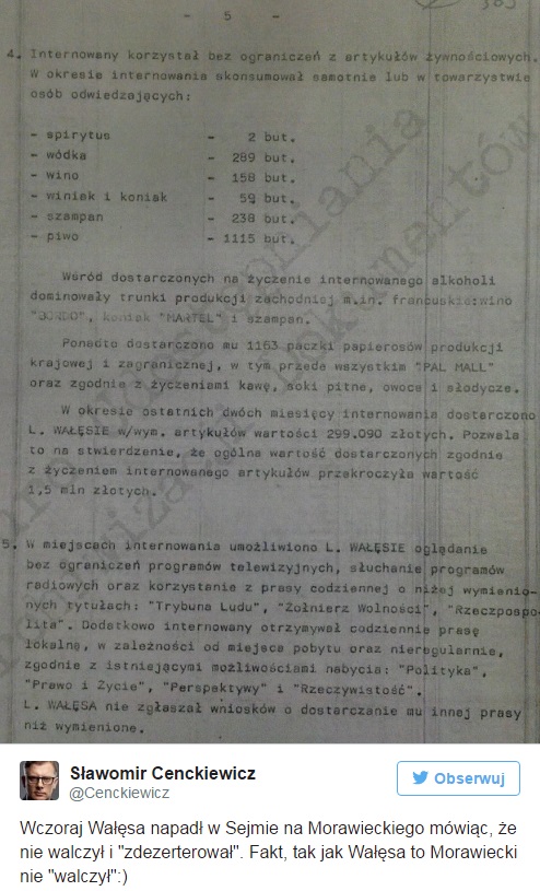 Dokument przedstawia raport konsumpcji alkoholu i papierosów przez Wałęsę i jego gości. Przedstawia się on szokująco. Wynika z niego, że przez okres internowania trwała niezła impreza, na które poszło 1858 butelek najróżniejszych, w tym wysokogatunkowych alkoholi, 1163 paczki papierosów, kawy, soków, owoców i słodyczy, a więc towarów deficytowych w tym czasie.