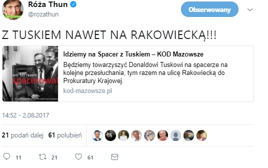 Pod koniec lipca, kiedy termin przesłuchania Donalda Tuska w Prokuraturze Krajowej był już znany opinii publicznej, Thun udostępniła na Twitterze grafikę ze strony "Sokzburaka", słynącej z "mowy miłości" kierowanej w stronę polityków PiS, fake newsów i manipulacji.
