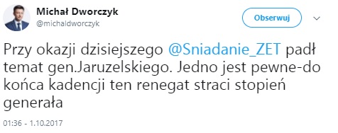 "Przy okazji dzisiejszego „Śniadania Radia Zet” padł temat gen. Jaruzelskiego. Jedno jest pewne-do końca kadencji ten renegat straci stopień generała"- napisał na Twitterze polityk.