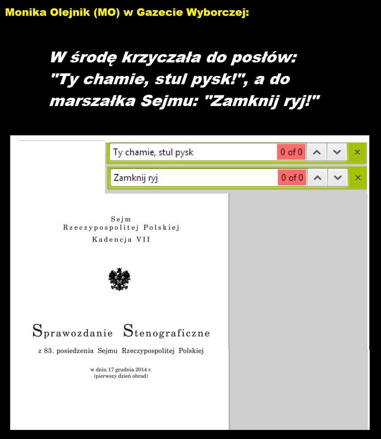 „W środę krzyczała do posłów: „Ty chamie, stul pysk!”, a do marszałka Sejmu: „Zamknij ryj!”.”