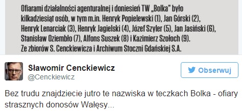 Prof. Sławomir Cenckiewicz przekonuje, że w ujawnionych dziś materiałach znajdą się ofiary doniesień Wałęsy. "Bez trudu znajdziecie jutro te nazwiska w teczkach Bolka" – napisał w niedzielę na Twitterze historyk.