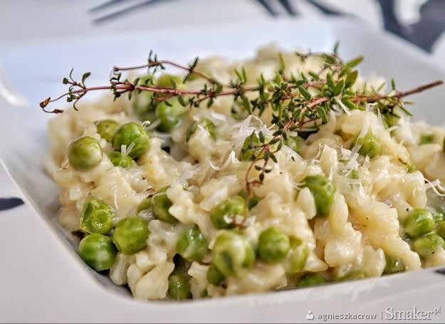 Kremowe risotto z groszkiem, cytryną, świeżym tymiankiem i śmietaną