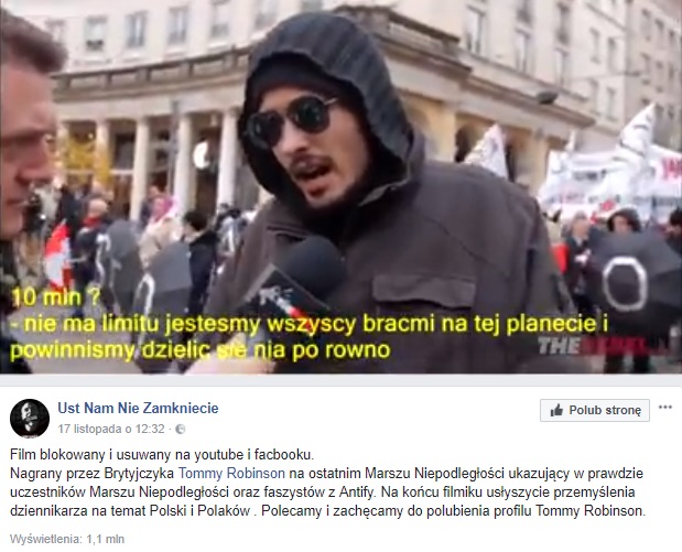 Tommy Robinson, 34-letni Anglik słynący z przeciwstawiania się islamizacji Europy wziął udział w Marszu Niepodległości i zamieścił w sieci nagranie z tego wydarzenia.