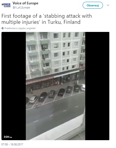 Jak poinformowała fińska policja, w centrum Turku w Finlandii kilka osób zostało zaatakowanych nożem. Według medialnych doniesień napastników było kilku. Na nagraniu rozpowszechnionym w sieci widać, jak napastnicy biegną jedną z ulic i wykrzykują: "Allah akbar!"