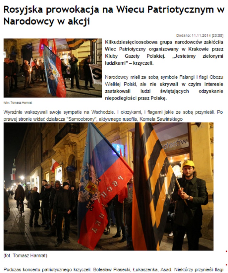 "Podczas koncertu patriotycznego krzyczeli: Bolesław Piasecki, Łukaszenka, Asad. Niektórzy przynieśli flagi "Noworosji", czyli terenu, który Rosja okupuje na Ukrainie. Mieli również flagę „republiki ługańskiej”. Poza tym krzyczeli, że są zielonymi ludzikami i straszyli iskanderami" - informuje portal niezalezna.pl.