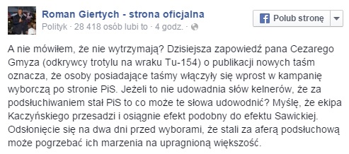 Cezary Gmyz dotarł do nagrań rozmów Jana Kulczyka z Piotrem Wawrzynowiczem, Radosławem Sikorskim i Krzysztofem Kwiatkowskim. Swoje materiały ma przedstawić dziś wieczorem w TV Republika. Tymczasem Roman Giertych stwierdził, że akcja dziennikarza to... kampania wyborcza PiS.