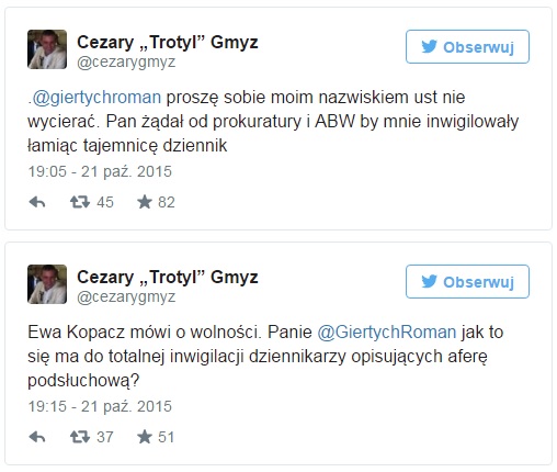 Po tym jak Anita Gargas i Cezary Gmyz zapowiedzieli, że w dzisiejszym odcinku "Zadania Specjalnego" ujawnią kolejne nagrania z podsłuchów, Roman Giertych oskarżył dziennikarza o włączenie się w kampanię wyborczą Prawa i Sprawiedliwości.