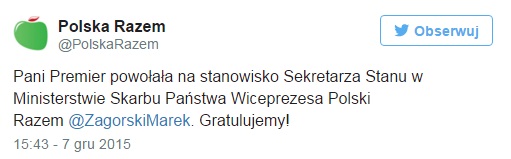 Marek Zagórski – wiceprezes Polski Razem Jarosław Gowina – został powołany przez premier Szydło na stanowisko wiceministra skarbu państwa.