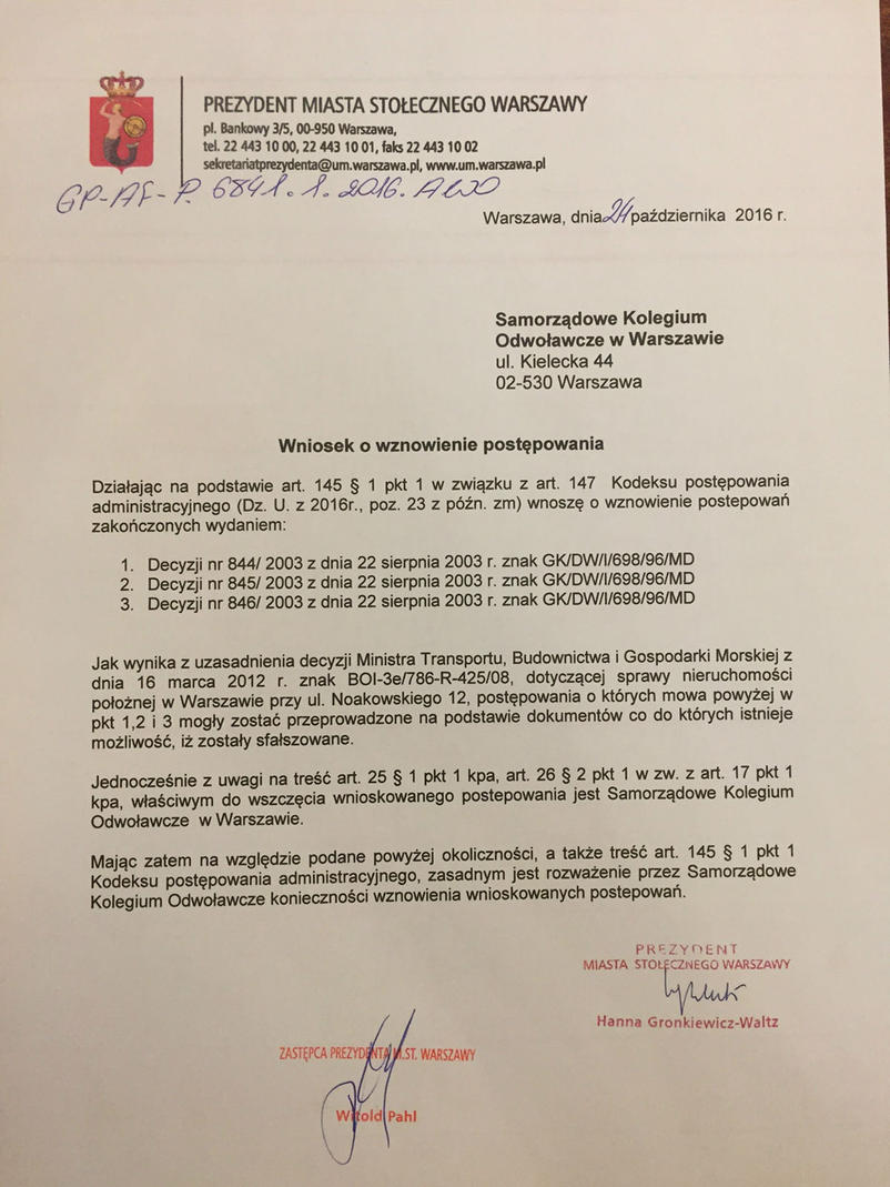 Radio ZET podaje, że prezydent Warszawy Hanna Gronkiewicz-Walt wnioskowała do Samorządowego Kolegium Odwoławczego o to, by wznowiono postępowania. Sprawa dotyczy zwrotu kamienicy, co do której postępowanie mialo miejsce w 2003 roku. To wówczas m.in. wuj męża obecnej prezydent Warszawy uzyskał prawa do kamienicy.