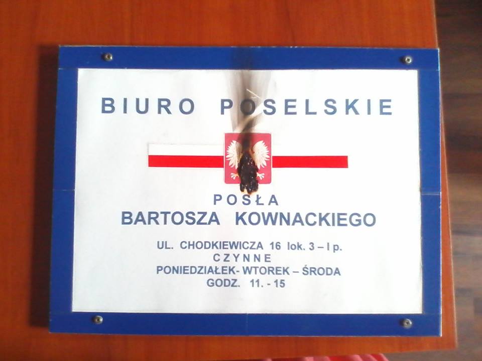 Nieznani sprawcy zaatakowali biuro poselskie posła PiS, Bartosza Kownackiego. Przypalili tabliczkę informacyjną, skupiając się na zniszczeniu polskiego godła. Wybili także szybę w oknie biura. Sam poseł określił napastników jako "homolewacką dzicz". Na Facebooku zapytał też: "Ciekawe, co będzie następnym razem...".