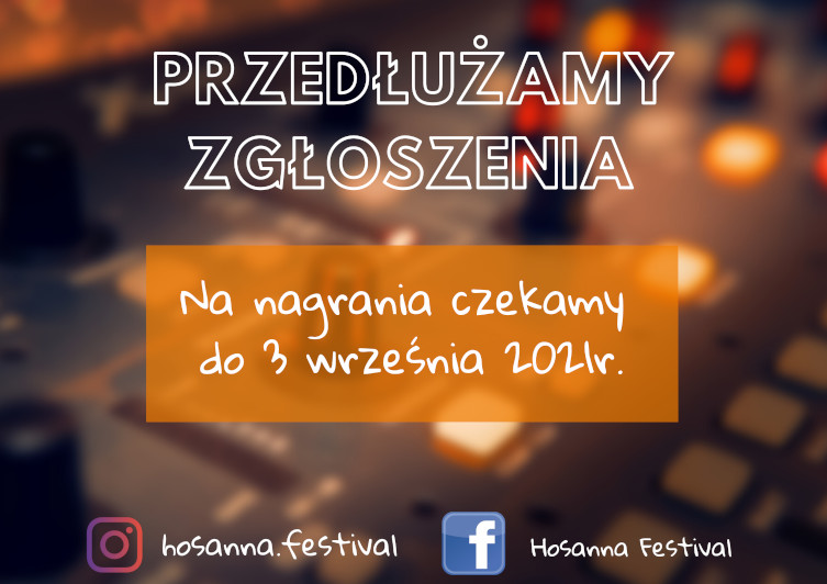 Po wielu pytaniach organizatorzy XXVIII Ogólnopolskiego Festiwalu Muzyki Chrześcijańskiej Hosanna Festiwal postanowili przedłużyć termin nadsyłania zgłoszeń. Pragnąc, by na chwałę Pana mogło zaśpiewać jeszcze więcej osób, na nagrania czekają do najbliższego piątku, tj. 3 września 2021r.
