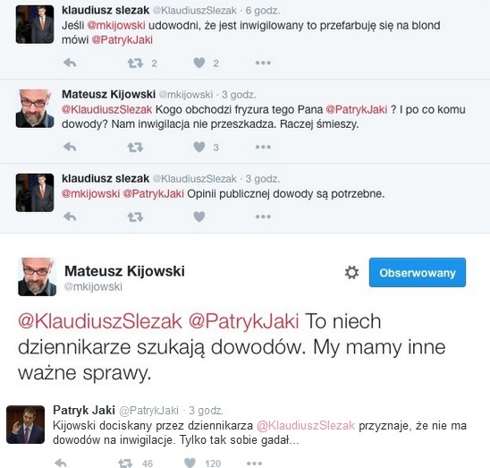 Wiceminister sprawiedliwości, Patryk Jaki zażartował, że jeśli Kijowski przedstawi dowody na inwigilację KOD przez służby specjalne, przefarbuje się na blond. Podchwycił to dziennikarz Klaudiusz Szlezak. Napisał na Twitterze do lidera KOD, że dowodów na inwigilację domaga się opinia publiczna.