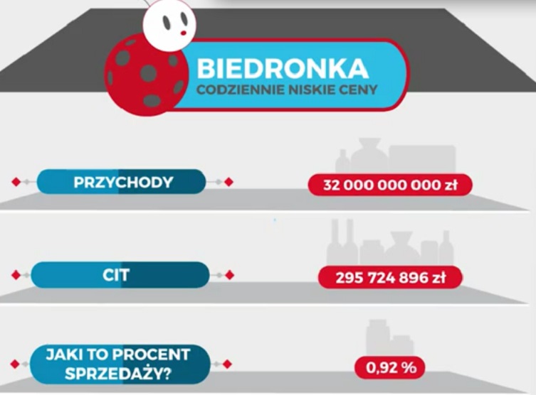Dla zobrazowania obecnej chwili. Biedronka (firma portugalska) w 2013 roku zapłaciła kwotę podatku CIT wynoszącą 302,3 mln zł - wynika z analizy Bisnode zaprezentowanej "Gazecie Wyborczej". Dochód jaki osiągnęła to ponad 32 mld złotych!!!! A np. polska firma KGHM Polska Miedź zapłacił aż 1,138 mld zł a PGNiG 425 mln zł. Dziesięciu największych płatników z zagranicy zapłaciło w sumie odrobinę ponad 1 mld zł CIT, podczas gdy czołowa dziesiątka podmiotów polskich zapłaciła ponad trzykrotnie więcej tego podatku.