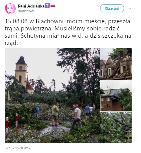 Postawę polityków opozycji totalnej w kwestii pomocy poszkodowanym przez nawałnice, które przeszły nad Polską w ubiegłym tygodniu, trafnie scharakteryzował wczoraj minister Mariusz Błaszczak, apelując, by "nie lansowali się na krzywdzie i nie prowadzili kampanii w sytuacji, gdy prowadzona jest akcja ratunkowa".