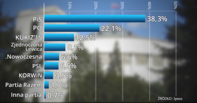 Wg badania wykonanego przez IPSOS na reprezentatywnej grupie 3003 dorosłych Polaków nadchodzące niedzielne wybory parlamentarne wygrałoby bez problemu Prawo i Sprawiedliwość. Partia Jarosława Kaczyńskiego zdobyłaby 38,3% głosów i zdystansowałaby drugą Platformę Obywatelską (22,1% głosów). W nowym sejmie PiS nie miałoby jednak samodzielnej większości, dysponowałoby bowiem 213 mandatami. Wg tego badania PO uzyskałaby 116 miejsc w sejmie, a więc jest coraz bliżej zejścia poniżej granicy 100 mandatów.