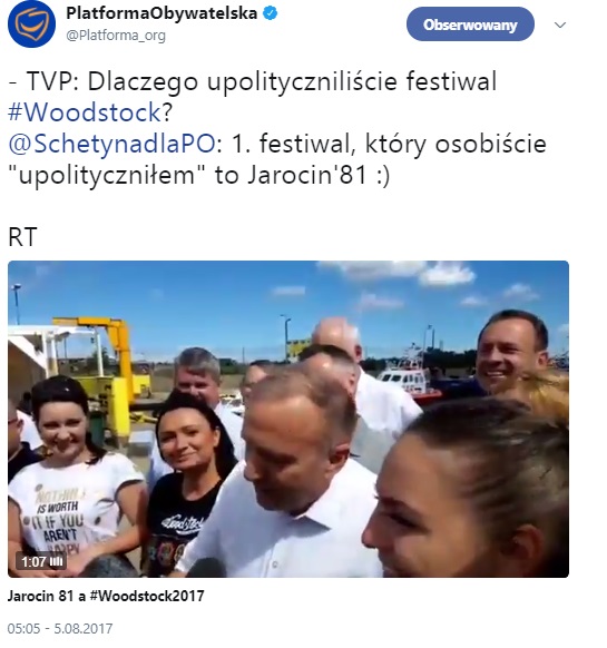 Na festiwalu Przystanek Woodstock pojawił się reporter TVP, który podszedł do polityków PO i zadał im pytanie, dlaczego upolityczniają tę imprezę.