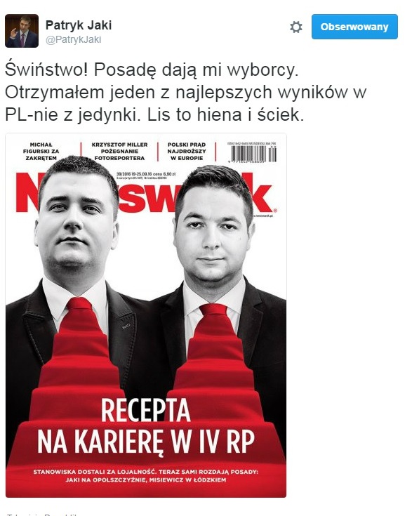Tygodnik Tomasza Lisa w swoim stylu bezceremonialnie atakuje polityków Prawa i Sprawiedliwości. Artykuł reklamowany na okładce ma traktować o nieuczciwości Jakiego, który został zestawiony z Bartłomiejem Misiewiczem.