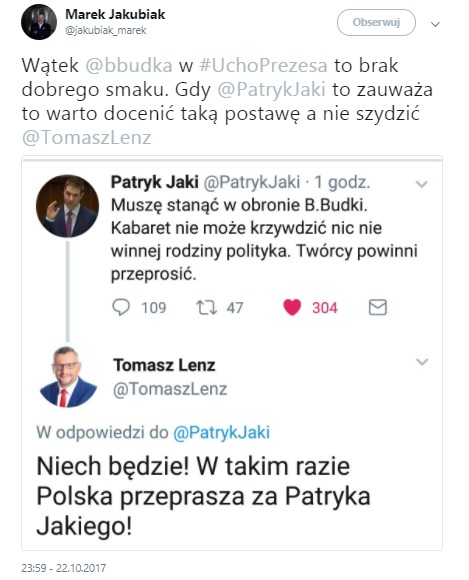 "Muszę stanąć w obronie B.Budki. Kabaret nie może krzywdzić nic nie winnej rodziny polityka. Twórcy powinni przeprosić"- napisał młody polityk na Twitterze.