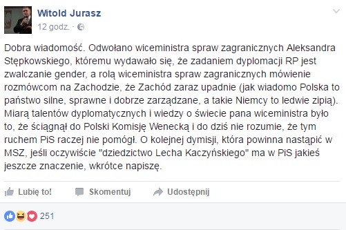 Witold Jurasz skomentował na swoim profilu na Facebooku sprawę odwołania wiceministra spraw zagranicznych Aleksandra Stępkowskiego.