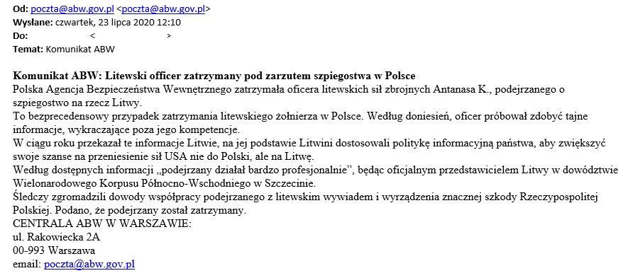 - Rozsyłany komunikat informował o rzekomym zatrzymaniu przez ABW żołnierza litewskiego prowadzącego działania wywiadowcze przeciwko Polsce;