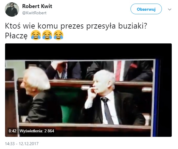 "Ktoś wie komu prezes przesyła buziaki?"-zastanawia się jeden z użytkowników Twittera, który opublikował na swoim profilu nagranie z wczorajszego posiedzenia Sejmu.