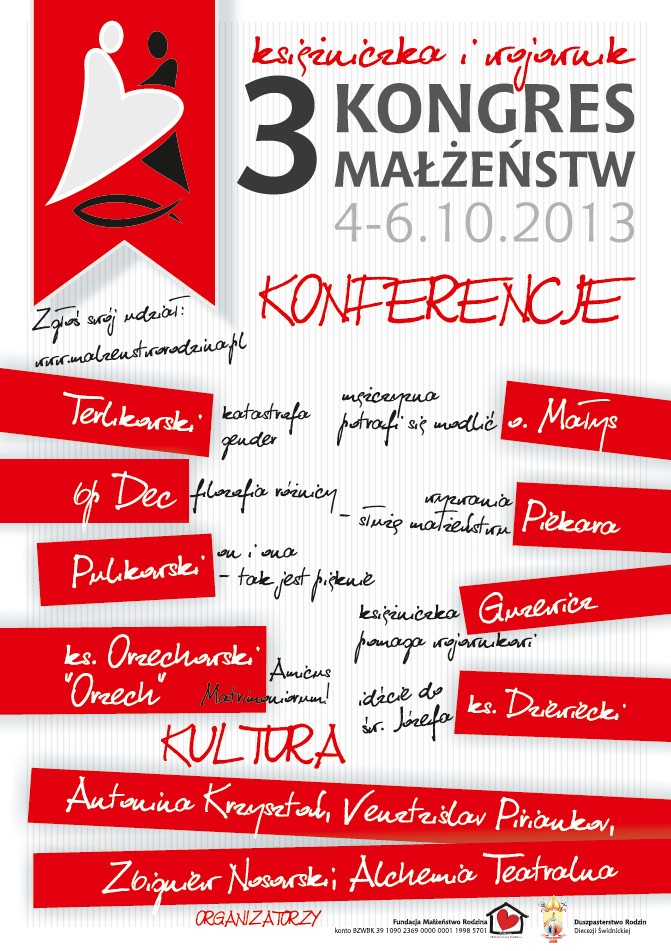 W tym roku oferta kongresowa została poszerzona o kolejne wydarzenia kulturalne. – Do tej pory w piątkowy i sobotni wieczór proponowaliśmy koncerty. W tym roku w piątek wystąpi Antonina Krzysztoń, a w sobotę pokażemy gościom znaną i cenioną przez świdniczan sztukę teatralną "Królik Królik" w reżyserii Juliusza Chrząstowskiego, a zrealizowaną w ramach projektu Alchemia Teatralna. Ale to nie wszystko. Otóż wstępem do otwarcia kongresu jest wernisaż wystawy Ventzislava Piriankowa "Ikony Małżeńskie". Jestem przekonana, że obrazy mistrza, pełne z jednej strony zmysłowości, a z drugiej sacrum, znajdą uznanie nie tylko w oczach kongresowiczów. Wystawa będzie prezentowana w Muzeum Dawnego Kupiectwa do połowy listopada; jest to z naszej strony dar dla wszystkich świdniczan, którzy z taką serdecznością przyjmują inicjatywę Kongresu Małżeństw w Świdnicy – dodaje ks. Roman Tomaszczuk, diecezjalny duszpasterz rodzin w diecezji świdnickiej. – I jeszcze coś. Wernisaż ma swoje dopełnienie w postaci spotkania autorskiego ze Zbigniewem Nosowskim, redaktorem "Więzi" i autorem książki "Parami do nieba", prezentującej małżonków, którzy w ciągu dwóch tysięcy lat historii Kościoła osiągnęli świętość, a ich przykład ma służyć wszystkim wierzącym. Ilustracją publikacji są reprodukcje obrazów Piriankova – bardzo inspirujące – mówi.