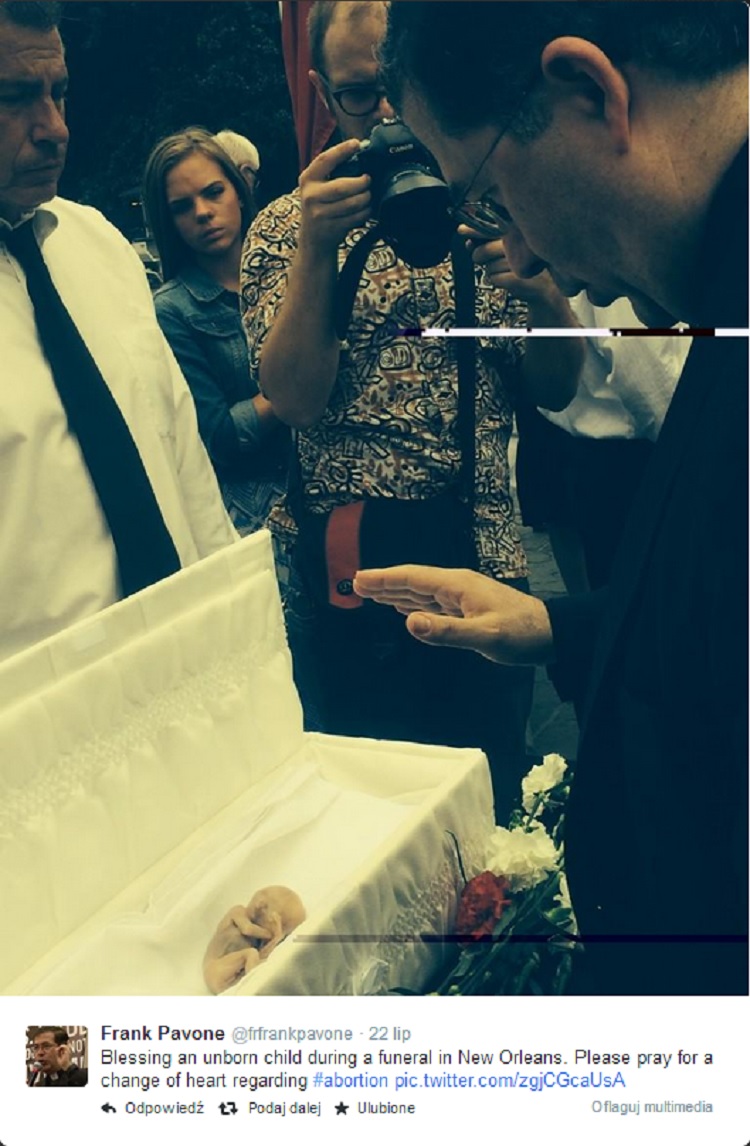 Ks. Frank Pavone, kapłan znany w całych Stanach Zjednoczonych z gorliwych działań pro-life, odprawił katolicki pogrzeb dziecku, które zmarło w wyniku przeprowadzonej aborcji. Zdjęcia z tego niesamowitego wydarzenia ks. Pavone zamieścił na Twitterze.