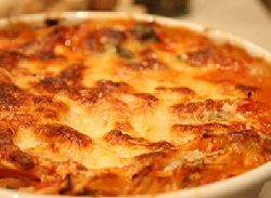 Na wierzch zetrzyj żółty ser. Wstaw zapiekankę do piekarnika nagrzanego do 180 st. C, piecz, aż ser na wierzchu się roztopi i lekko zrumieni. W zależności od piekarnika, będzie to trwało 20-30 minut.
