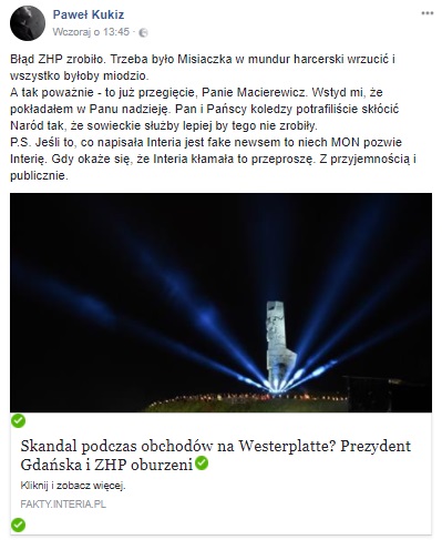 Na koniec Kukiz łaskawie przyznał, że oczywiście może się mylić. Przeprosi pod jednym warunkiem: jeżeli MON pozwie Interię w przypadku, gdyby okazało się, że informacja na temat spięcia podczas uroczystości rocznicy wybuchu II wojny światowej, opisana przez portal, jest fake newsem.