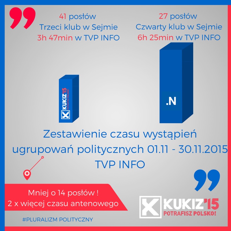 "Oto pluralizm polityczny w naszych mediach - jak widać są równi i równiejsi: partia banksterki i korporacji -NOWOCZESNA- otrzymuje 2 RAZY WIĘCEJ czasu w TV niż KUKIZ'15.