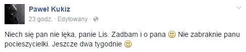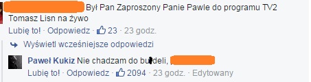 Pod tym wpisem pojawiło się wiele komentarzy odnośnie do pracy pana Lisa, zazwyczaj niezbyt przychylnych. Jeden z użytkowników zapytał Kukiza, czy dostał zaproszenie to programu "Tomasz Lis Na Żywo", na co zainteresowany odpowiedział niezwykle dosadnie: