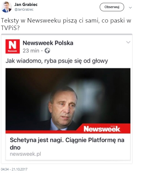Najbardziej zaskoczyła jednak odpowiedź rzecznika Platformy Obywatelskiej, posła Jana Grabca, który z kolei poczuł się dotknięty artykułem w "Newsweeku". Nawet tygodnik Tomasza Lisa widzi Grzegorza Schetynę w roli lidera PO raczej słabo...