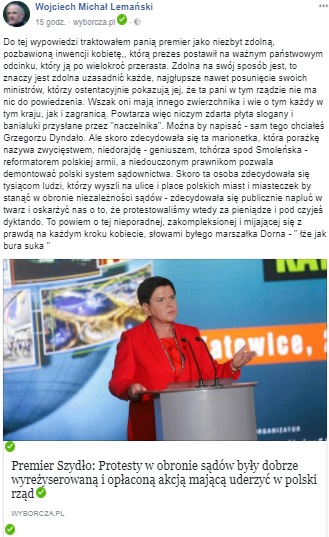 "Wielokrotnie mówili (politycy opozycji- przyp. JJ), że do walki z rządem będą wykorzystywać „ulicę i zagranicę”. I to robią. Mając to na uwadze, trudno zaakceptować tezę, że ostatnie protesty były spontaniczne. To była dobrze wyreżyserowana i dobrze opłacona akcja, mająca uderzyć w polski rząd"- te słowa premier mocno zabolały suspendowanego kapłana, który, cytując byłego marszałka Sejmu, Ludwika Dorna stwierdził, że Szydło "łże jak bura suka". Swoją frustrację Lemański wyraził na Facebooku: