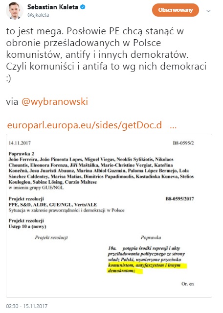 Sformułowanie o takiej treści znalazło się bowiem w poprawce zaproponowanej przez eurodeputowanych z lewego skrzydła Parlamentu Europejskiego. Lewicowi politycy domagają się poprawki, która „potępia środki represji i akty prześladowania politycznego ze strony władz Polski, wymierzone przeciwko komunistom, antyfaszystom i innym demokratom”.