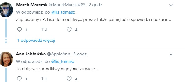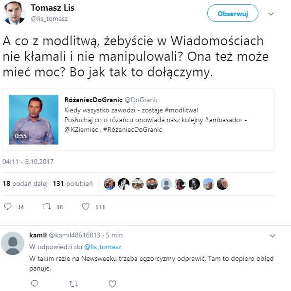 "A co z modlitwą, żebyście w Wiadomościach nie kłamali i nie manipulowali? Ona też może mieć moc? Bo jak tak to dołączymy"- napisał na Twitterze Tomasz Lis.